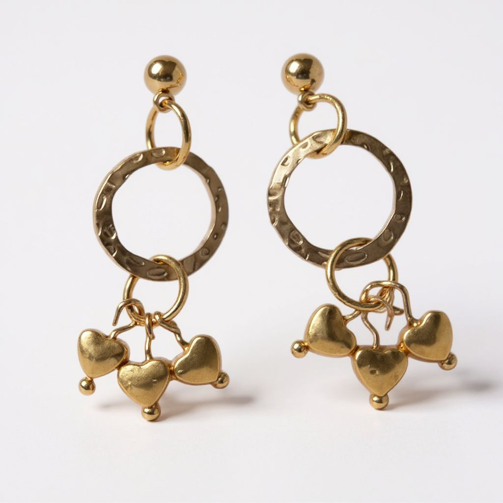 Delicate gold toned earrings featuring heart embellishments